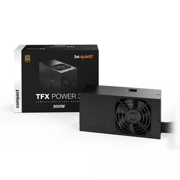 A TFX Power 3 300 W Gold: a továbbfejlesztett be quiet! nagy hatékonyságú táp mini és multimédiás PC-khez, 80 PLUS Gold minősítéssel és PCIe grafikus kártya támogatással.