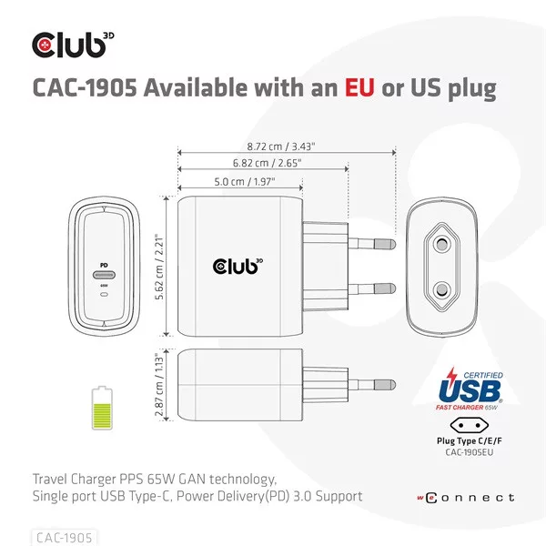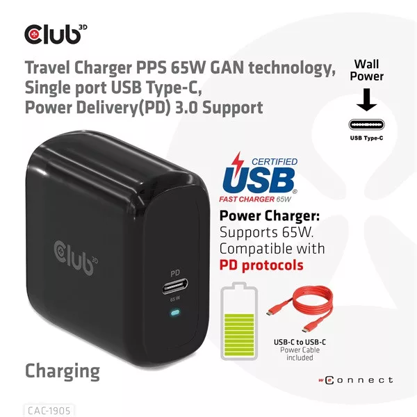 Club3D CAC-1905 Utazó Többportos Gyors TöltőA Club3D CAC-1905 utazó töltő PPS 65W GAN technológiával készült, egyetlen USB Type-C porttal rendelkezik és támogatja a Power Delivery(PD) 3.0 szabványt. Kompakt mérete és kiemelkedő teljesítménye miatt ideális választás, utazás közben is egyszerűen hordozható. A GAN technológiás chipkészletnek köszönhetően a töltő 50%-kal kisebb, mint egy 65W MacBook töltő, és a különféle PD eszközökhöz kompatibilis, a mobiltelefonoktól a laptopokig. A széleskörű kompatibilitásnak köszönhetően üzleti utazás vagy nyaralás során is kényelmes társ lehet.