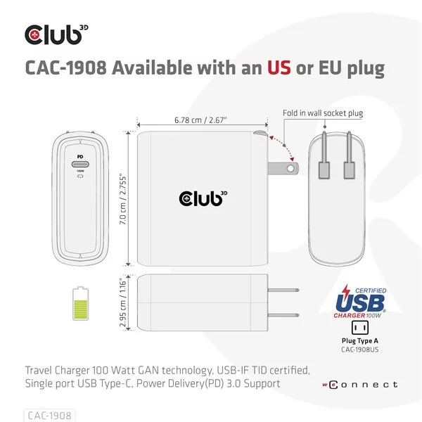 Termék neve: Club 3D CAC-1908EU Utazótöltő