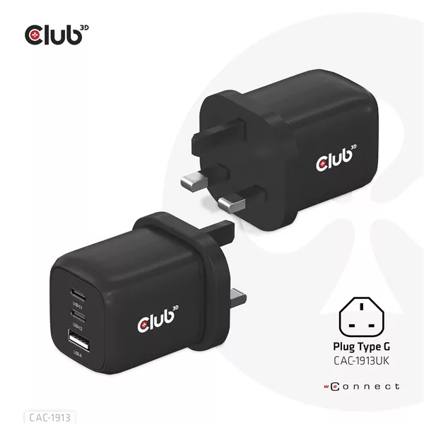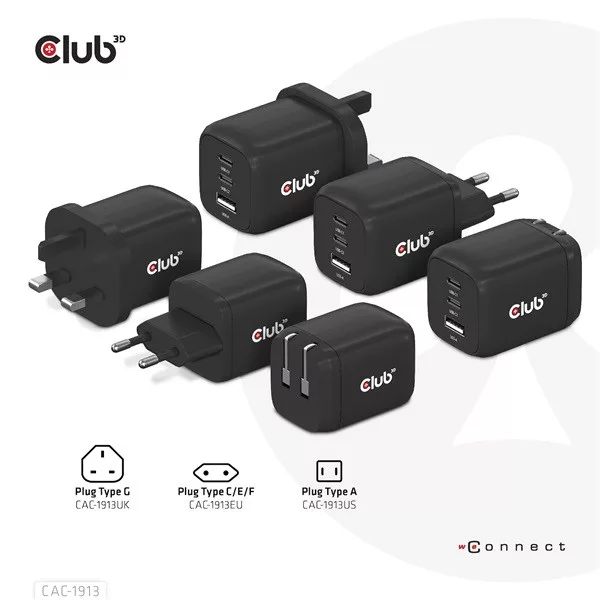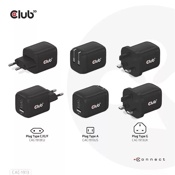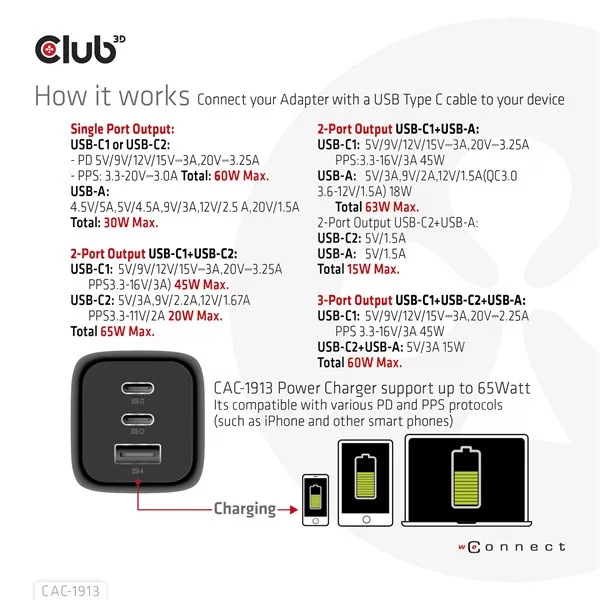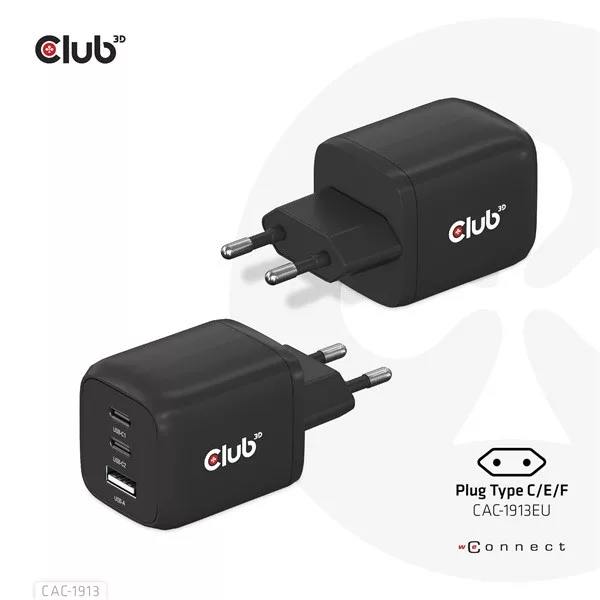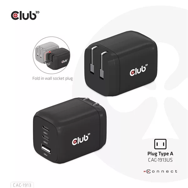 A Club3D CAC-1913 Utazó Töltő 65W GAN technológiával rendelkezik. A három portos kivitel (2x USB Type-C + USB Type-A) Power Delivery (PD) 3.0 támogatással. A GAN technológiának köszönhetően ez a töltő 50%-kal kisebb, mint egy hagyományos 65 wattos töltő, így bárhová magaddal viheted.
