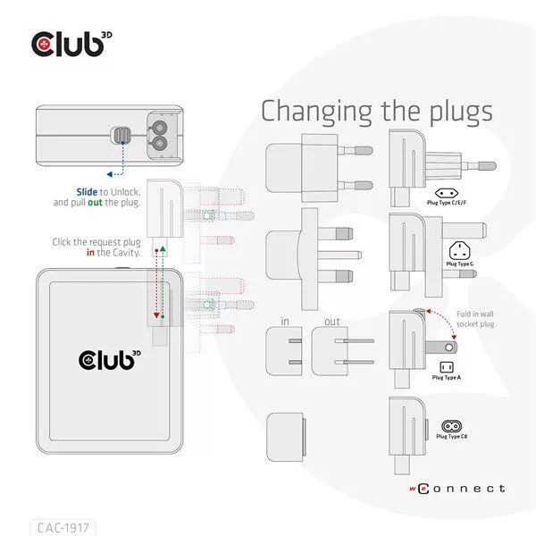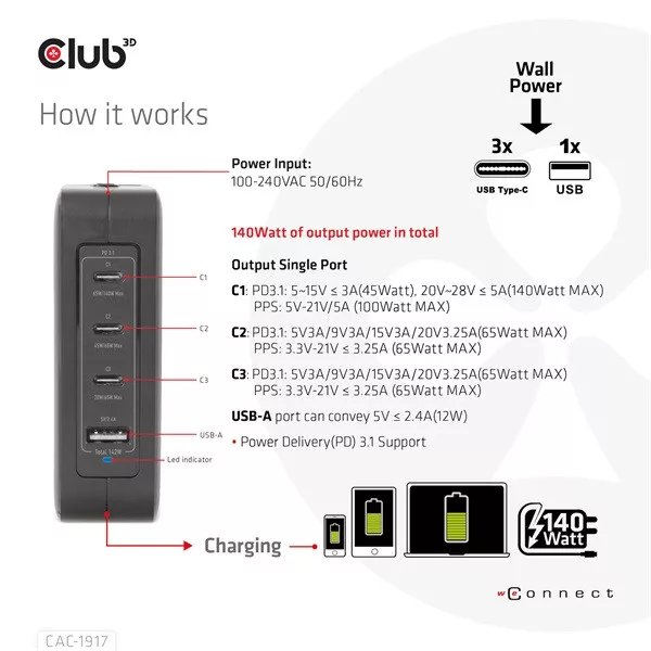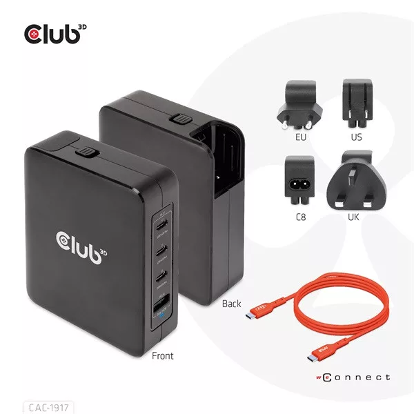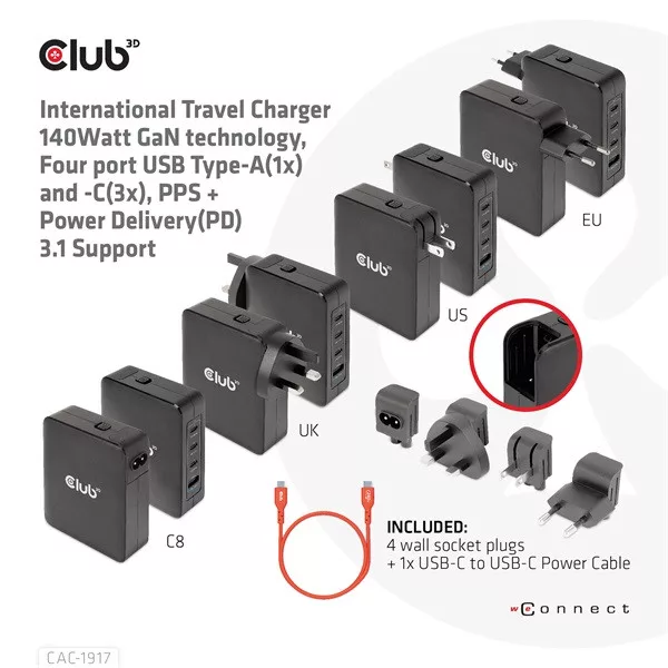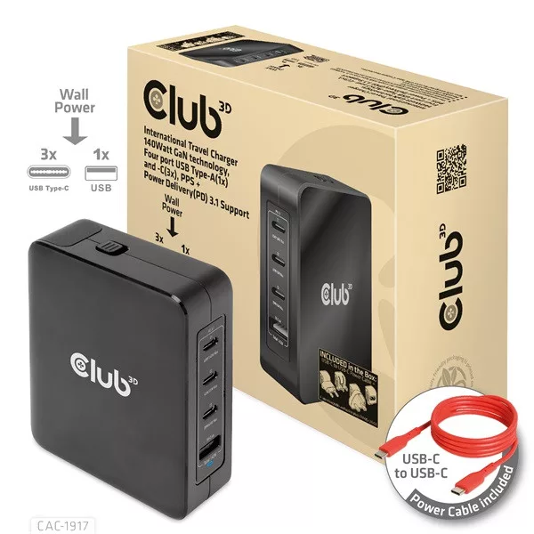 A Club 3D CAC-1917 Nemzetközi utazó töltő 140W GaN technológiával, négy USB porttal (1x Type-A, 3x Type-C), PPS + PD 3.1 támogatással egy kiváló teljesítményű és divatos dizájnnal rendelkező utazótöltő.