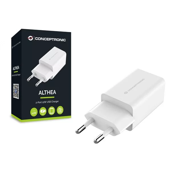 This 2 port USB charger is the ideal solution for charging an iPad or tablet, as well as most other devices that use a USB connection. Plugging directly into a power socket, the 2 port USB charger can handle voltages from 110 to 240 volt AC and converts them automatically to the 5 volt DC that USB devices use. As well as smart phones and tablets, the charger supports many other devises such as navigation systems, MP3 players and digital cameras. Thanks to the high output power and 2 USB ports, the versatile Conceptronic 2 Port USB Charger can charge 2 devices at the same time. A must-have for the office, at home or when travelling.