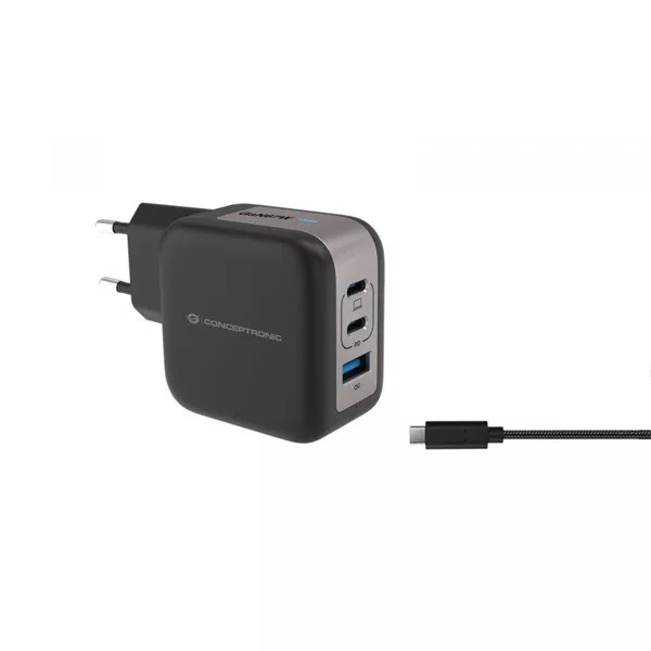 This charger leverages advanced Gallium Nitride (GaN) technology to deliver up to 67W of total power, ensuring faster and more efficient charging for your devices. It features a versatile port selection with 3 ports: 2 USB-C ports equipped with Power Delivery (PD) 3.0 and 1 USB-A port with Quick Charge (QC) 3.0. This setup allows for simultaneous charging of multiple devices with varying power requirements. The charger supports a broad range of output options from 3.3V to 20.0V, making it compatible with a wide array of devices, from smartphones to laptops. Enhanced safety is provided through built-in protections against overload, short-circuiting, and overheating, safeguarding both the charger and connected devices. Additionally, it incorporates USB Power Delivery (PD) 3.0 and Quick Charge (QC) 3.0 technologies for rapid charging, along with Programmable Power Supply (PPS) compliance to optimize charging efficiency and reduce heat generation. For added convenience, the charger comes with a 1.5m 3.0A USB-C to USB-C cable.