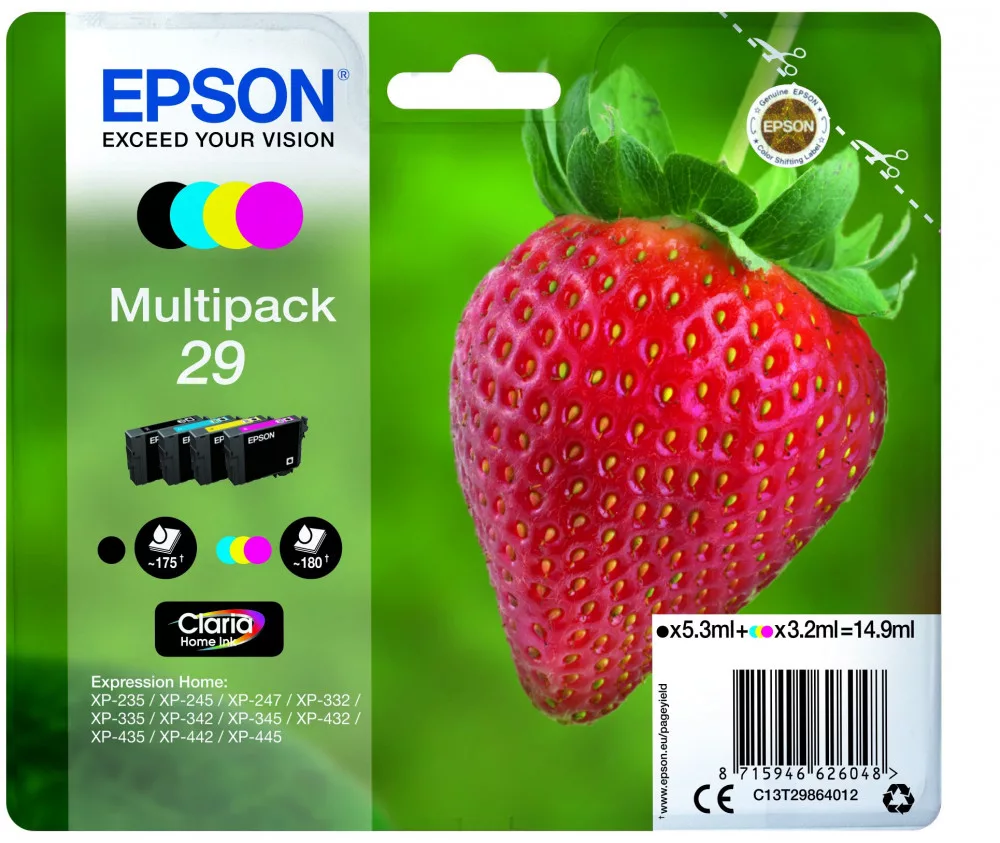 Epres" "Consumables: Ink Cartridges, Claria Home Ink, 29, Strawberry, Multipack, 1 x 3.2 ml Cyan, 1 x 3.2 ml Magenta, 1 x 5.3 ml Black, 1 x 3.2 ml Yellow, Standard