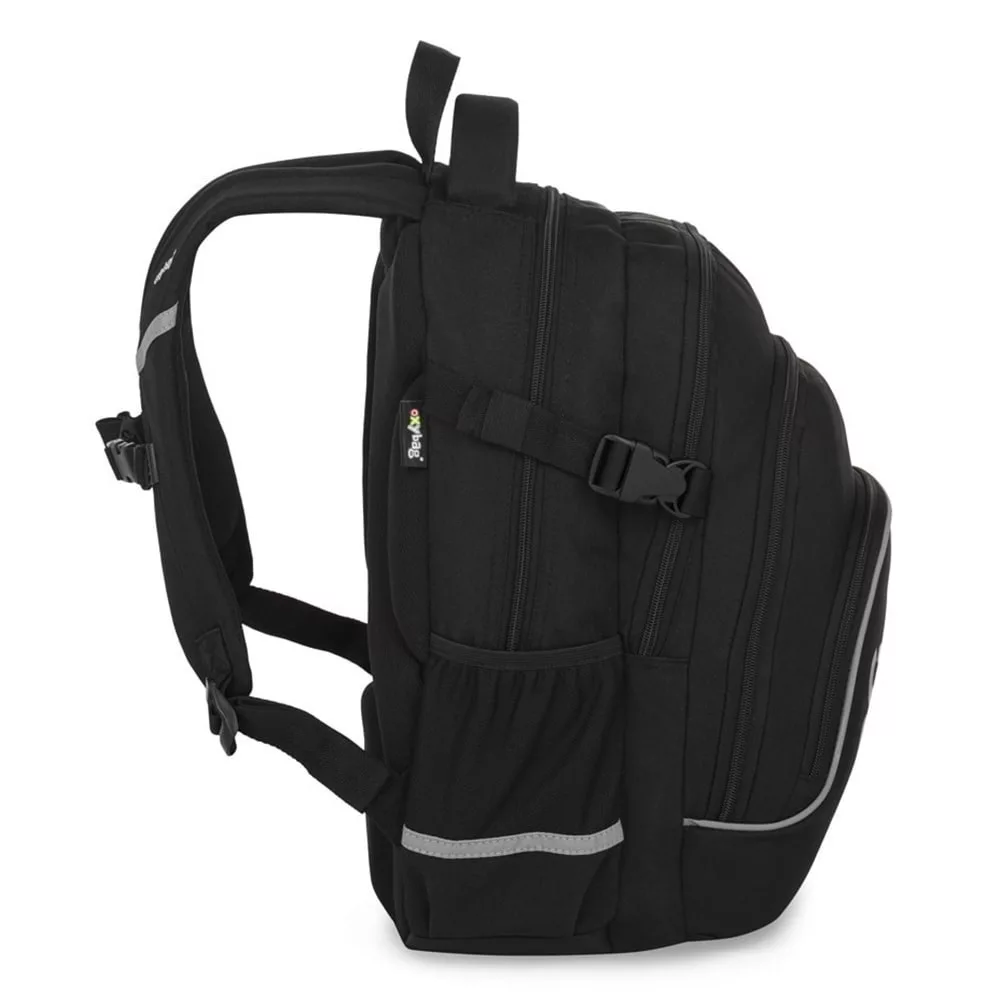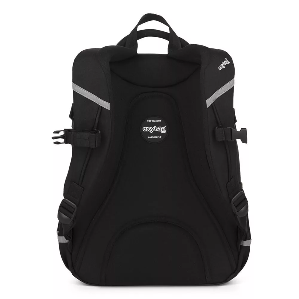 Az OXY Scooler hátizsák ideális választás 3. osztálytól azoknak, akiknek minden fontos dolognak helyet kell találniuk. A háromrekeszes kialakítás bőséges teret kínál tankönyveknek, füzeteknek és uzsonnának. Beépített rendszerező, belső zseb és laptoprekesz is található benne. Az oldalzseb tökéletes kulacsnak, a kulcs- vagy chip-tartó pedig megkímél a keresgéléstől. Az anatómiailag formázott, légáteresztő hátrész, az állítható vállpántok és a mellkaspánt hosszabb viselésnél is kényelmet biztosítanak. A megerősített, vízálló alj védi a tartalmat a nedvességtől, a fényvisszaverő elemek pedig növelik a biztonságot. Űrtartalom: 28 l, teherbírás: 8 kg.