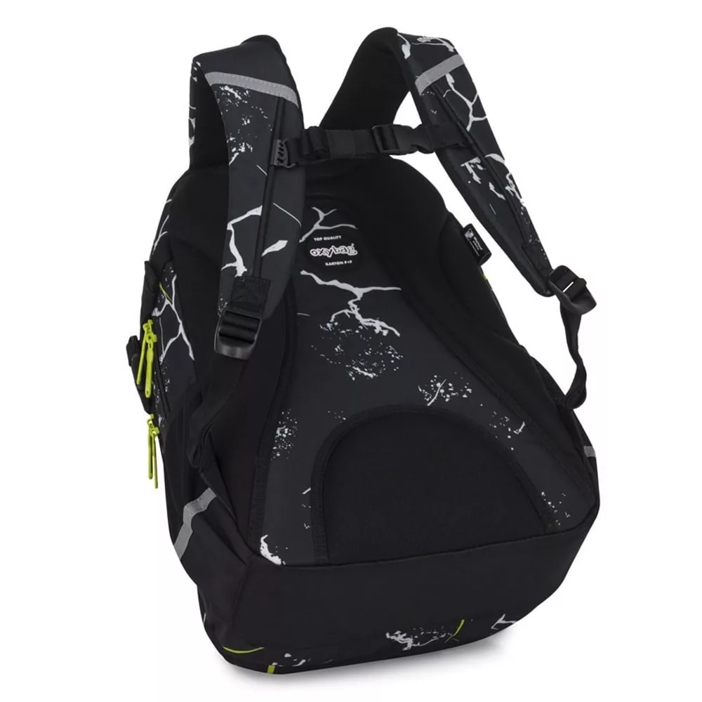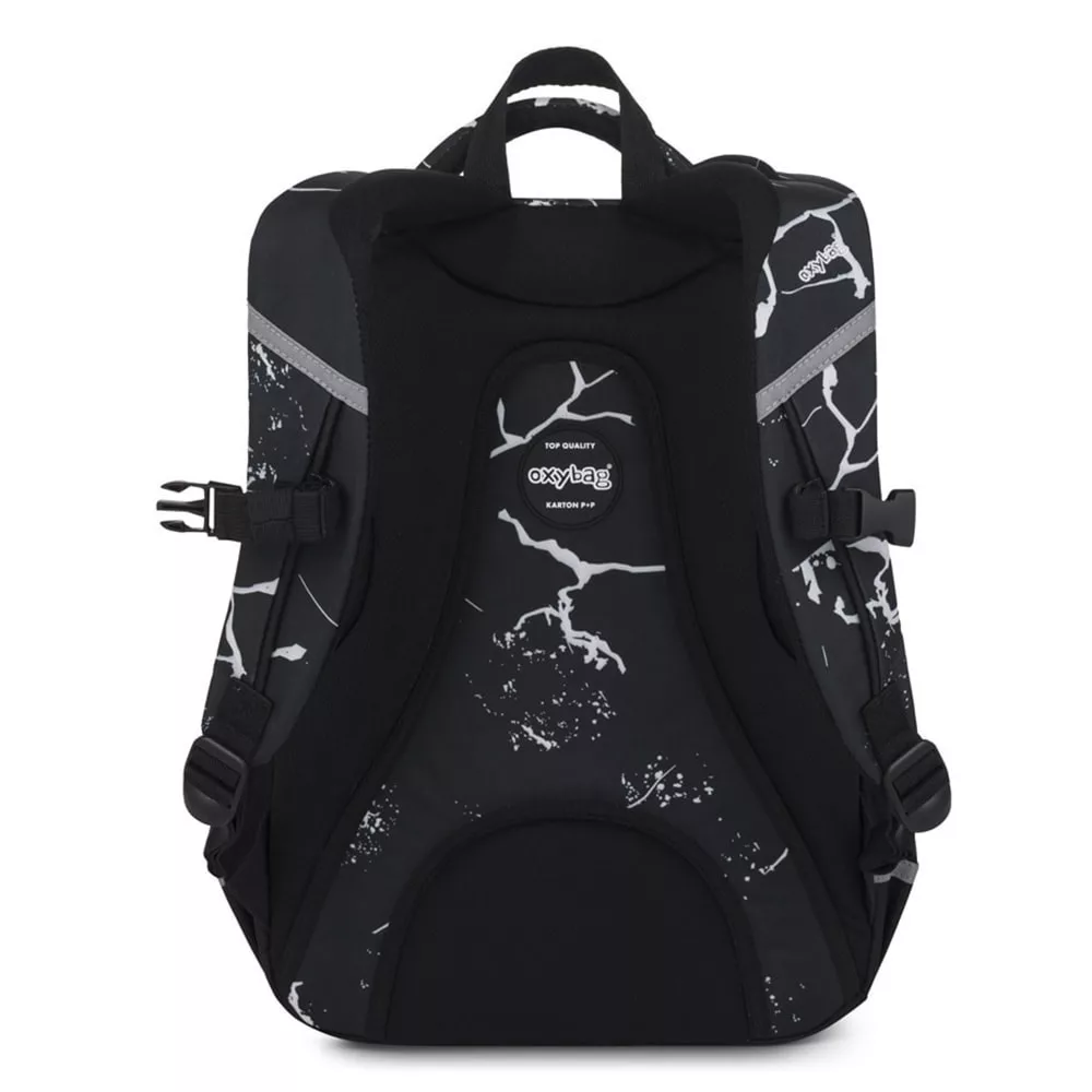 Az OXY Scooler hátizsák ideális választás 3. osztálytól azoknak, akiknek minden fontos dolognak helyet kell találniuk. A háromrekeszes kialakítás bőséges teret kínál tankönyveknek, füzeteknek és uzsonnának. Beépített rendszerező, belső zseb és laptoprekesz is található benne. Az oldalzseb tökéletes kulacsnak, a kulcs- vagy chip-tartó pedig megkímél a keresgéléstől. Az anatómiailag formázott, légáteresztő hátrész, az állítható vállpántok és a mellkaspánt hosszabb viselésnél is kényelmet biztosítanak. A megerősített, vízálló alj védi a tartalmat a nedvességtől, a fényvisszaverő elemek pedig növelik a biztonságot. Űrtartalom: 28 l, teherbírás: 8 kg.