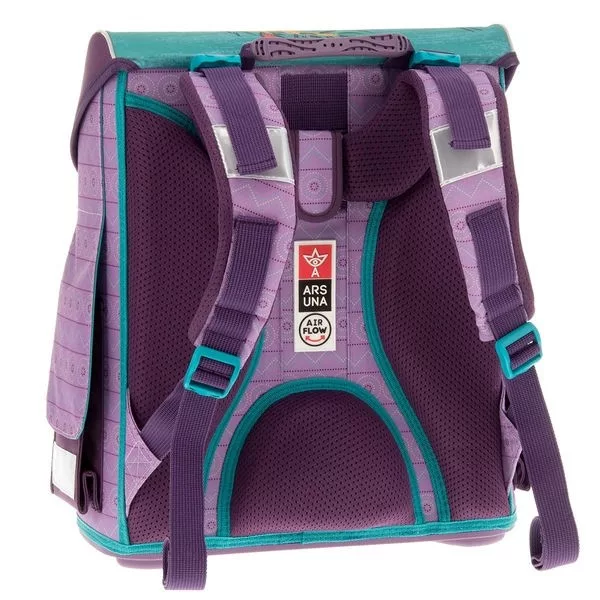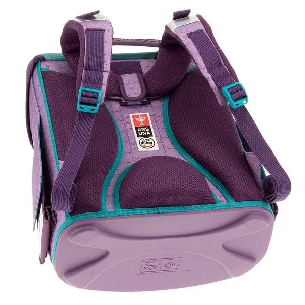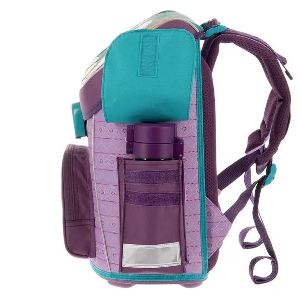 Hátizsák formájú iskolatáska. Könnyű súlyú, formatartó szerkezetű, vízlepergető anyagból.