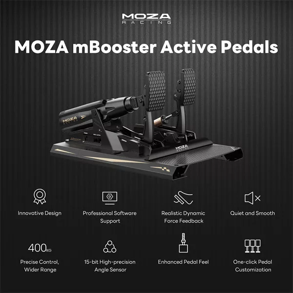 A MOZA mBooster Active Pedal újraértelmezi a szimulátorversenyzést a valósághű dinamikus erő-visszacsatolással és precíziós vezérléssel. Páratlan pontosságot és reagálóképességet biztosít, kettős 200 kg-os mérőcellás érzékelőkkel és egy 21 bites, nagy felbontású mágneses kódolóval rendelkezik. A nagy nyomatéksűrűségű motor és a MOZA Pit House szoftver lehetővé teszi a gáz-, fék- vagy kuplungfunkciók egyetlen kattintással történő testreszabását. Az állítható pedálérzettel, valós idejű ABS-szel, kipörgésgátlóval, motorrezgéssel és G-erő-visszacsatolással az mBooster magával ragadó és élethű vezetési élményt biztosít. Kompatibilis a CRP2 pedálokkal a fokozott teljesítmény és a MOZA Racing ökoszisztémákkal való zökkenőmentes integráció érdekében.