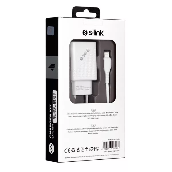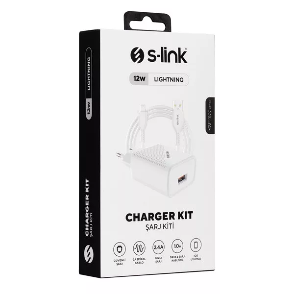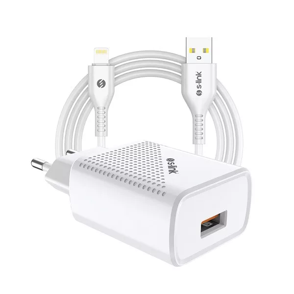 S-Link Hálózati töltő - SL-EC40L (1db USB, 5V/2.4A, 12W, Gyorstöltés, Lightning-USB 100cm adat+töltőkábel, fehér)