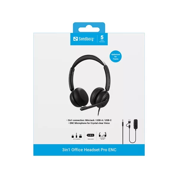A Sandberg 3in1 Office Headset Pro ENC teljes rugalmasságot biztosít, mivel 3,5 mm-es minijack, USB-A és USB-C csatlakozást is kínál – mindezt egy megoldásban. A mellékelt inline adapterrel szabályozhatod a hangot, némíthatod a mikrofont, és kezelheted a hívásokat közvetlenül a kábelen. Az ENC (Environmental Noise Cancelling) technológiával tisztán hallható leszel, még zajos környezetben is. A puha, párnázott fülkagylók és az állítható fejpánt órákon át tartó kényelmet biztosítanak. Tökéletesen működik a Microsoft Teams-ben. Modern munkakörnyezetekhez tervezve.
