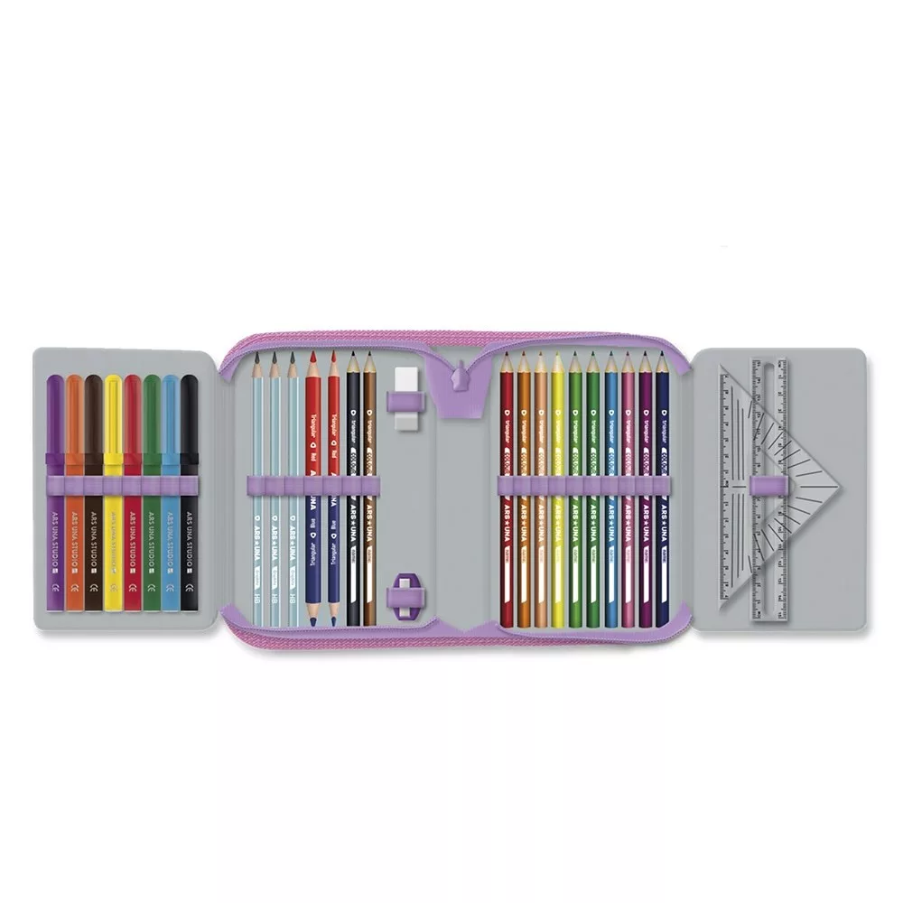 Írószerekkel töltött cipzáros tolltartó két kihajtható füllel, gumis kialakítással az írószerek tárolásához. Tartalma: 12 db színes ceruza, 3 db HB grafit ceruza, 1 vékony és 1 vastag postairón, 8 db színes filctoll, 1 db radír, 1 db hegyező, 1 db 17 cm-es egyenes vonalzó, 1 db háromszög vonalzó, órarend A és B hétre.