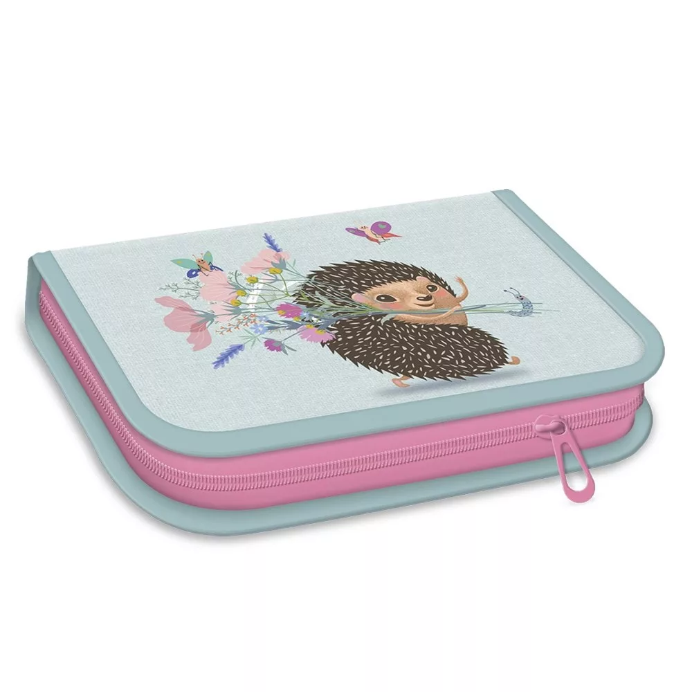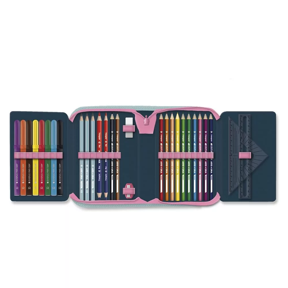 Írószerekkel töltött cipzáros tolltartó két kihajtható füllel, gumis kialakítással az írószerek tárolásához. Tartalma: 12 db színes ceruza, 3 db HB grafit ceruza, 1 vékony és 1 vastag postairón, 8 db színes filctoll, 1 db radír, 1 db hegyező, 1 db 17 cm-es egyenes vonalzó, 1 db háromszög vonalzó, órarend A és B hétre.