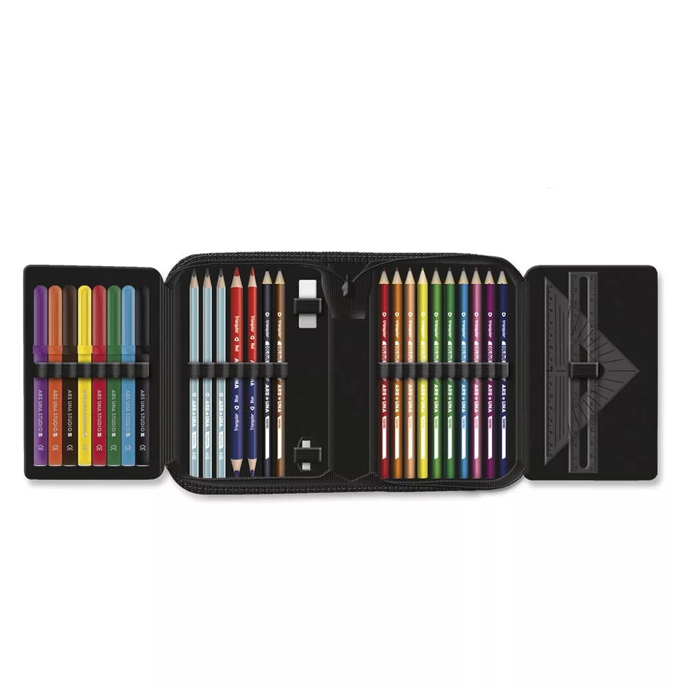 Írószerekkel töltött cipzáros tolltartó két kihajtható füllel, gumis kialakítással az írószerek tárolásához. Tartalma: 12 db színes ceruza, 3 db HB grafit ceruza, 1 vékony és 1 vastag postairón, 8 db színes filctoll, 1 db radír, 1 db hegyező, 1 db 17 cm-es egyenes vonalzó, 1 db háromszög vonalzó, órarend A és B hétre.