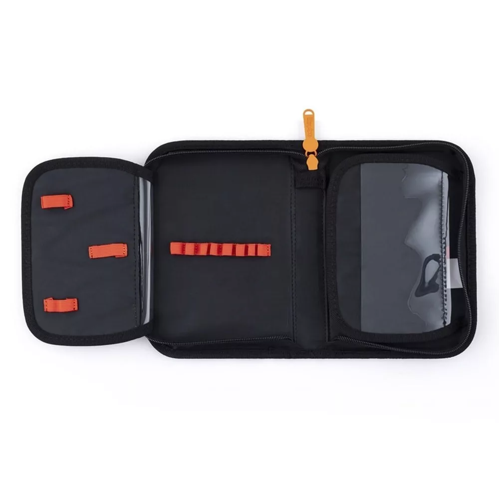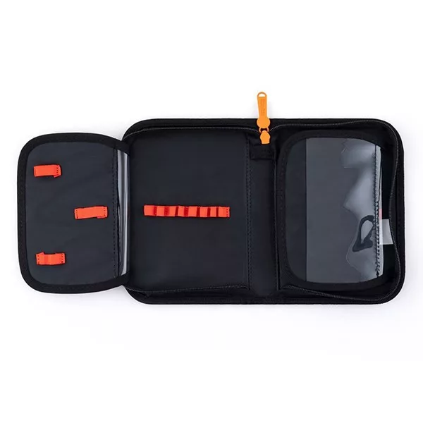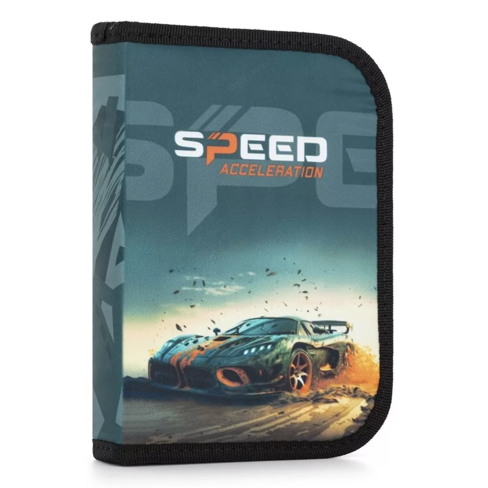 Egyszintes iskolai tolltartó 2 kihajtható füllel, üres. 25 gumipántot tartalmaz az írószerek rögzítéséhez. A belső füleken átlátszó fólia található az órarend számára.
