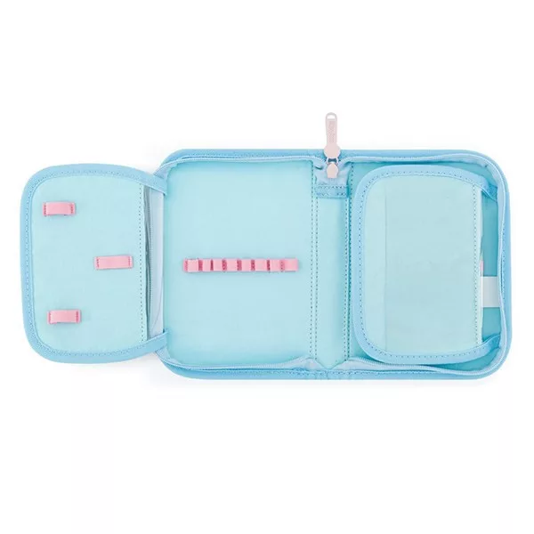 Egyszintes iskolai tolltartó 2 kihajtható füllel, üres. 25 gumipántot tartalmaz az írószerek rögzítéséhez. A belső füleken átlátszó fólia található az órarend számára.