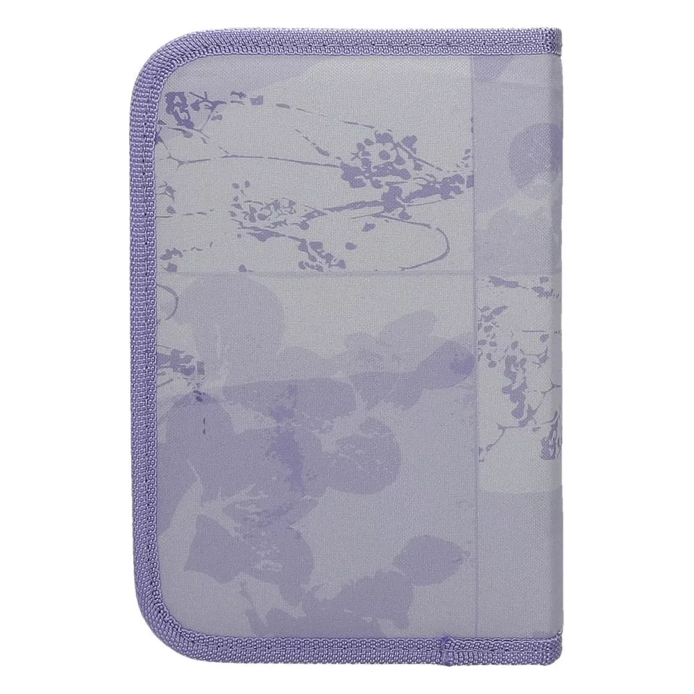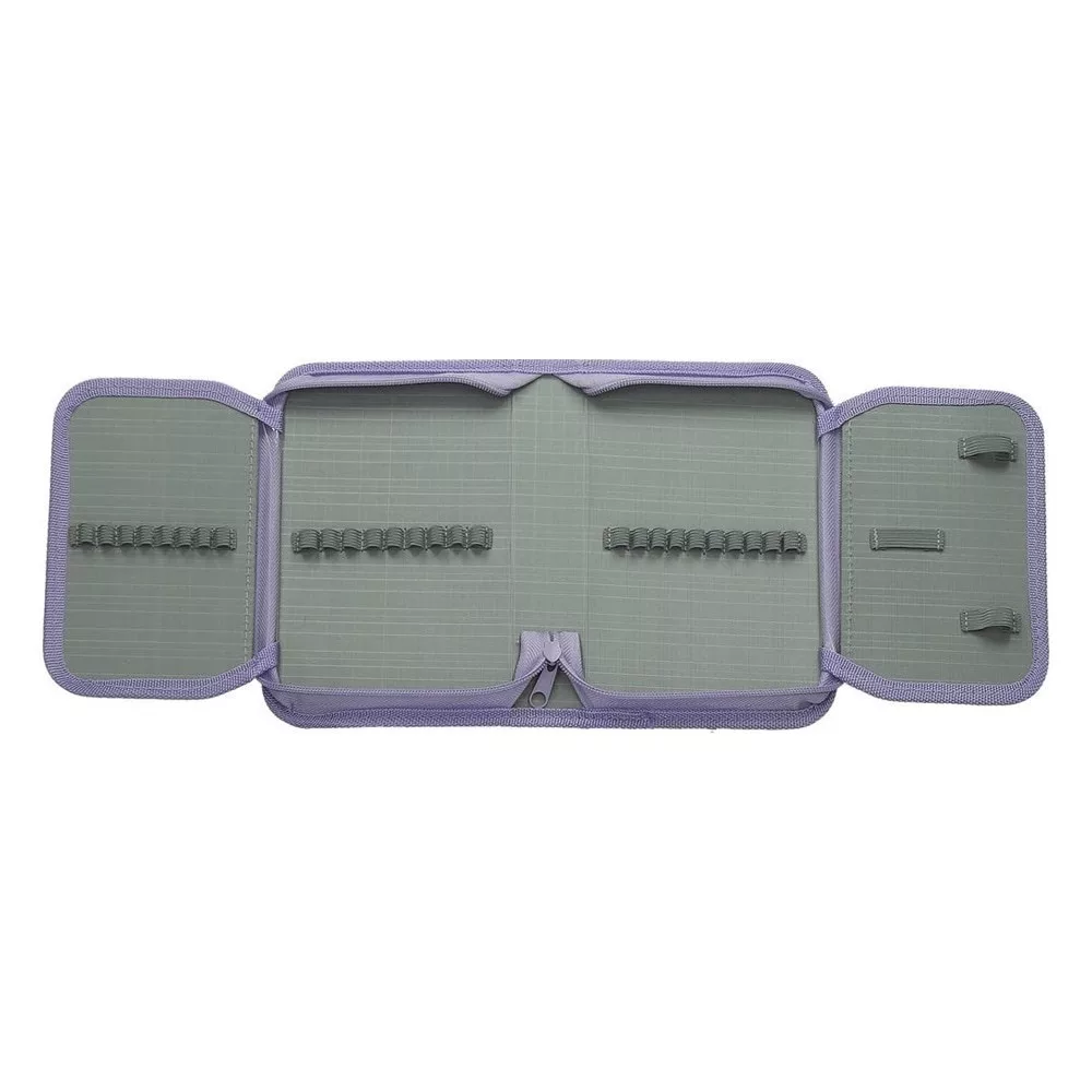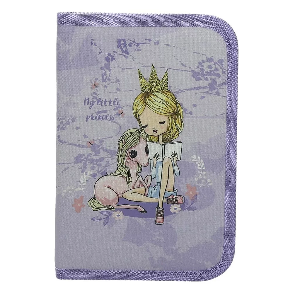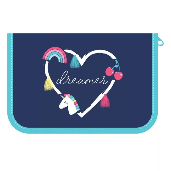 Egyszintes, írószerekkel töltött, két kihajtható füllel, cipzáros tolltartó gumis kialakítással az írószerek tárolásához.