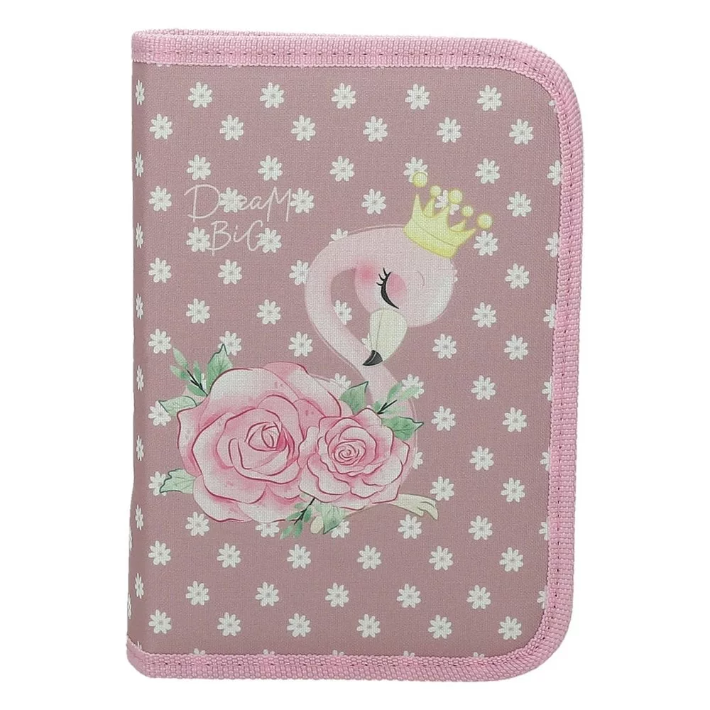 Egyszintes, írószerekkel töltött, két kihajtható füllel, cipzáros tolltartó gumis kialakítással az írószerek tárolásához.