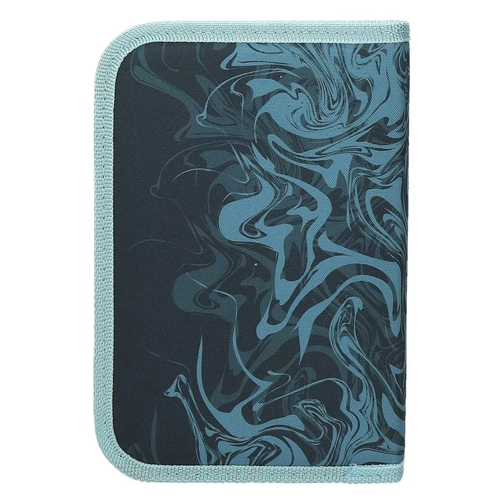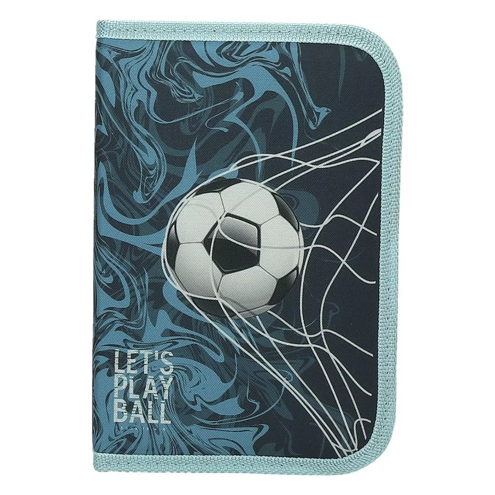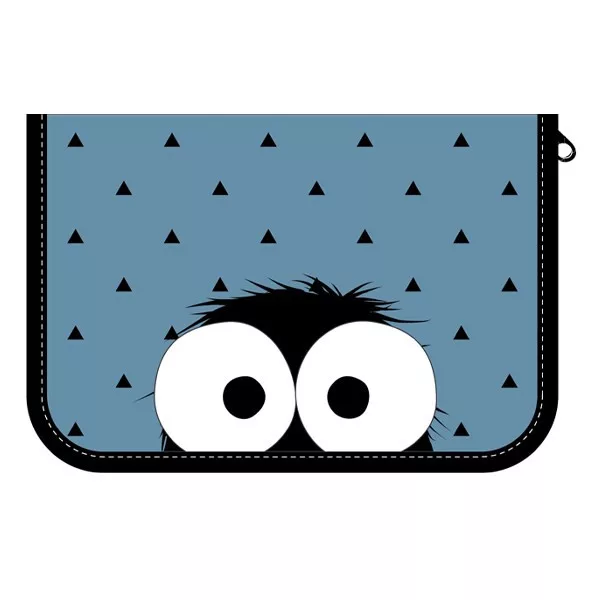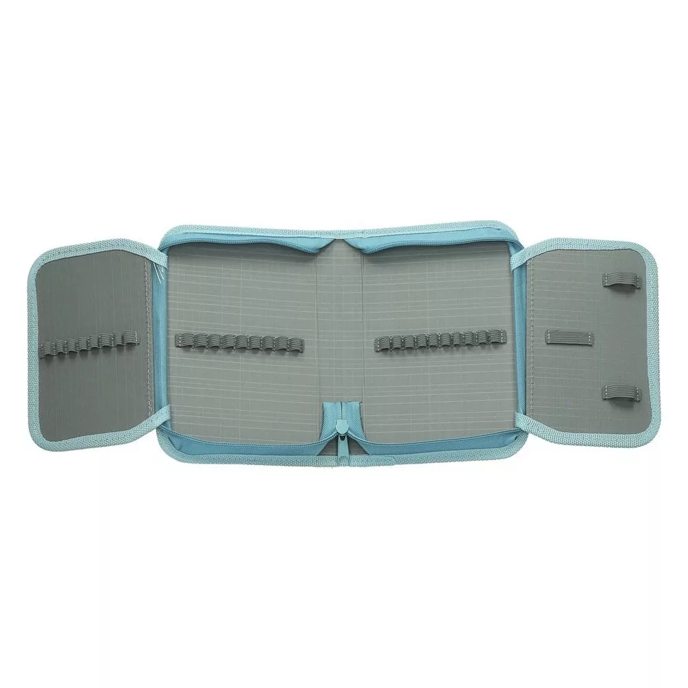 Egyszintes, írószerekkel töltött, két kihajtható füllel, cipzáros tolltartó gumis kialakítással az írószerek tárolásához.