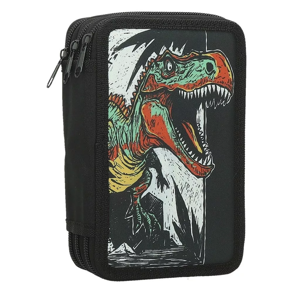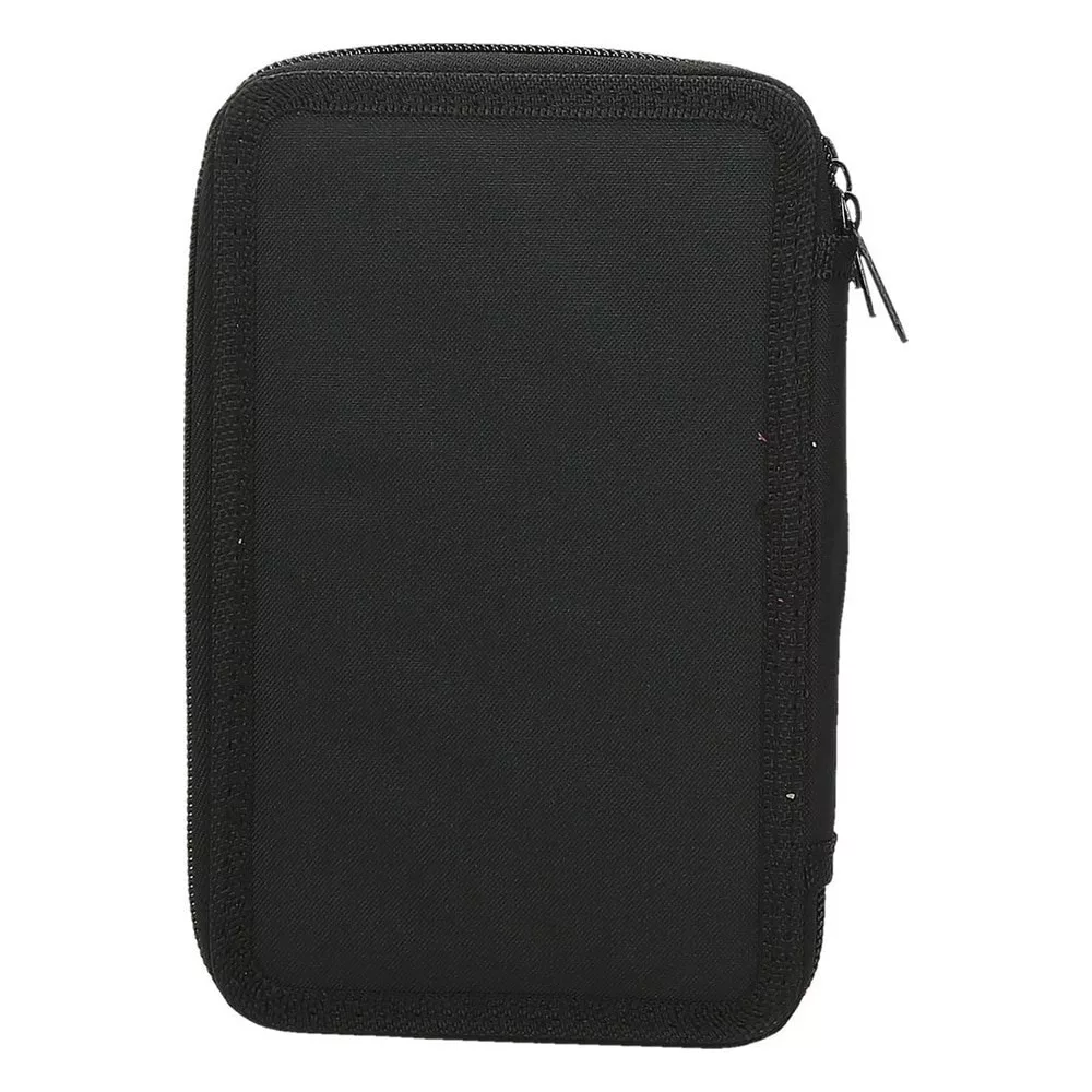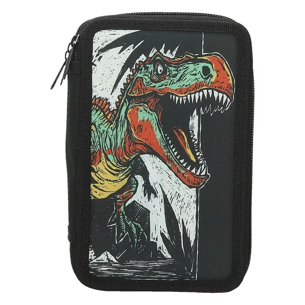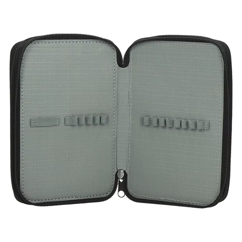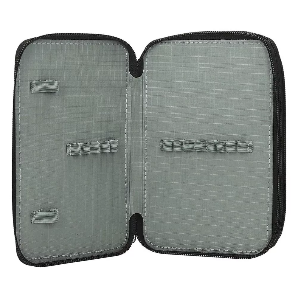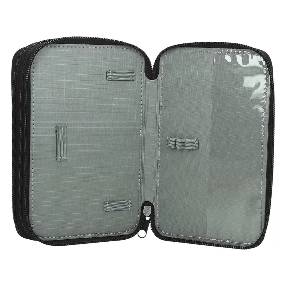 Többszintes, írószerekkel töltött cipzáros tolltartó gumis kialakítással az írószerek tárolásához.