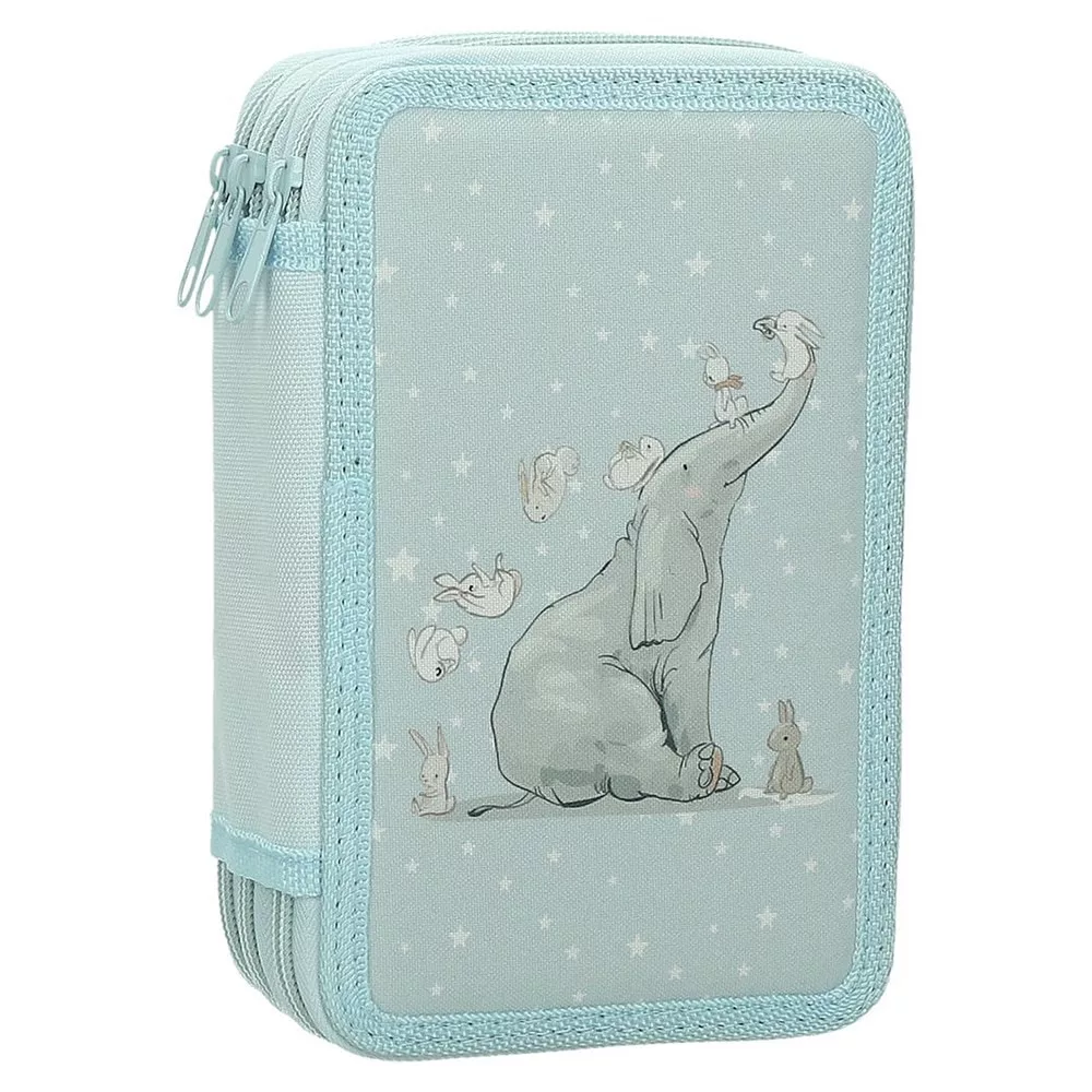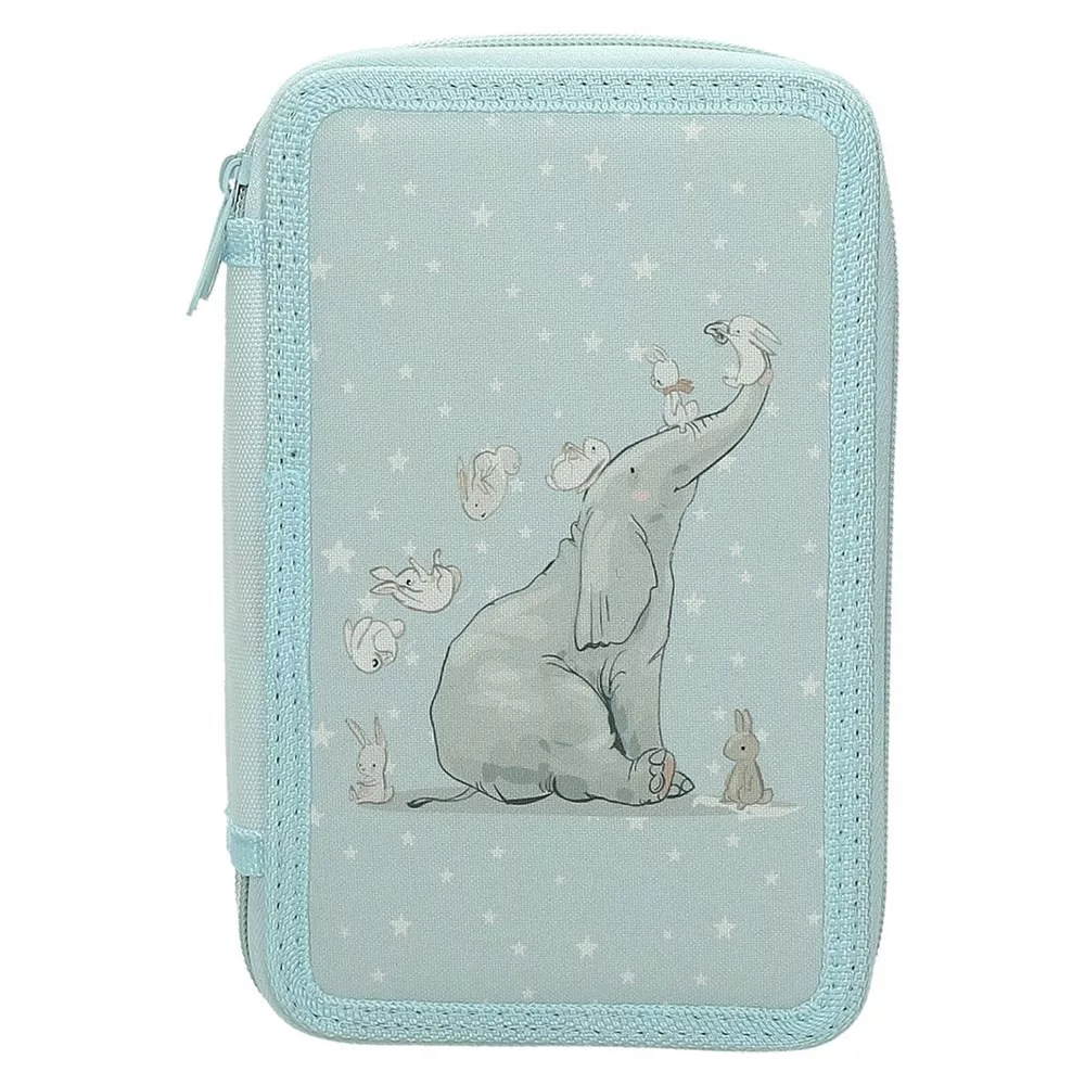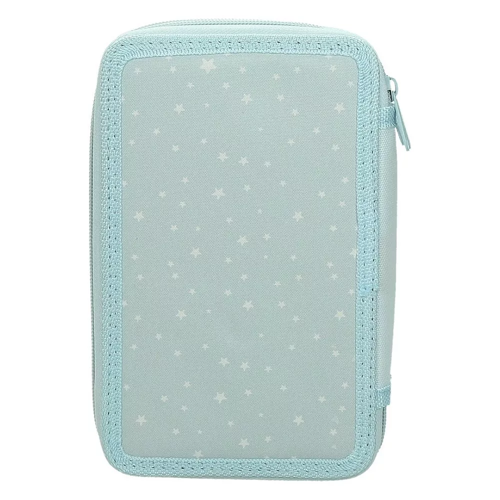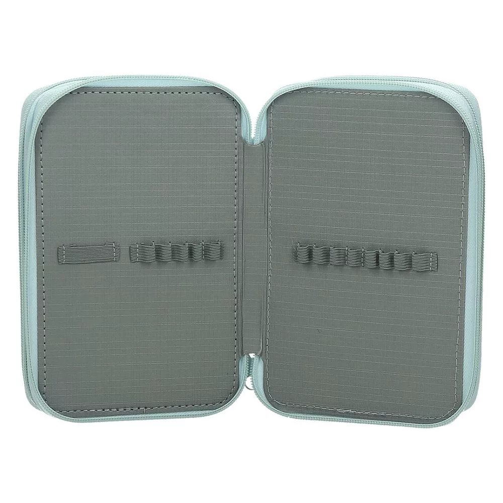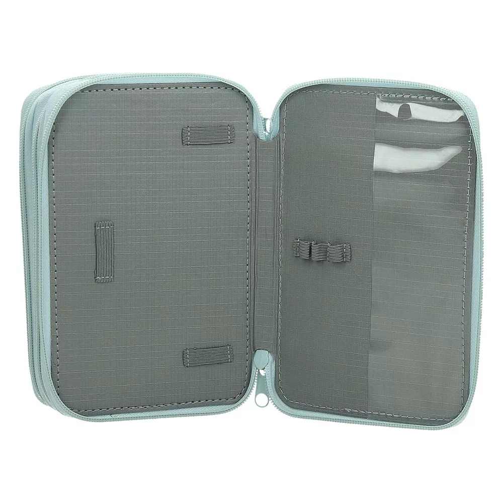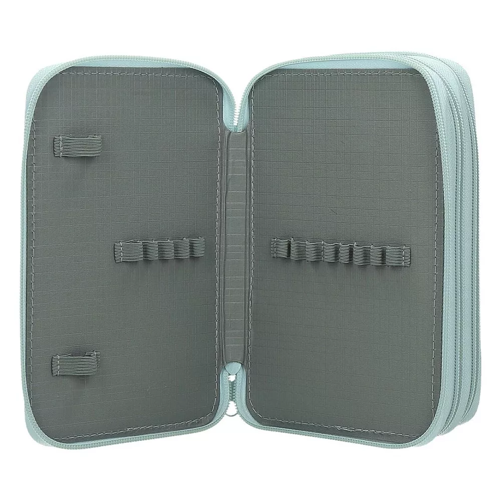 Belül textillel bevont merev lapokkal, gumis kialakítással az írószerek tárolásához, és egy cipzáras belső zsebbel.