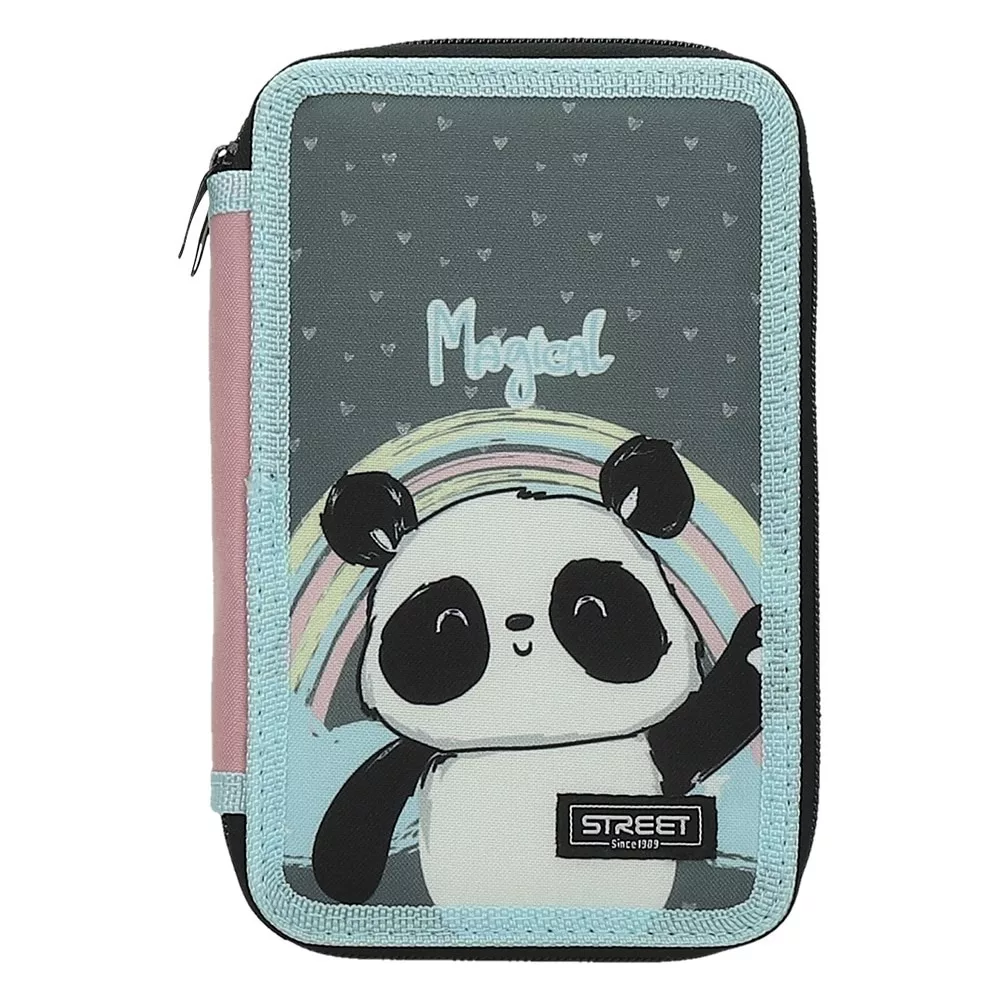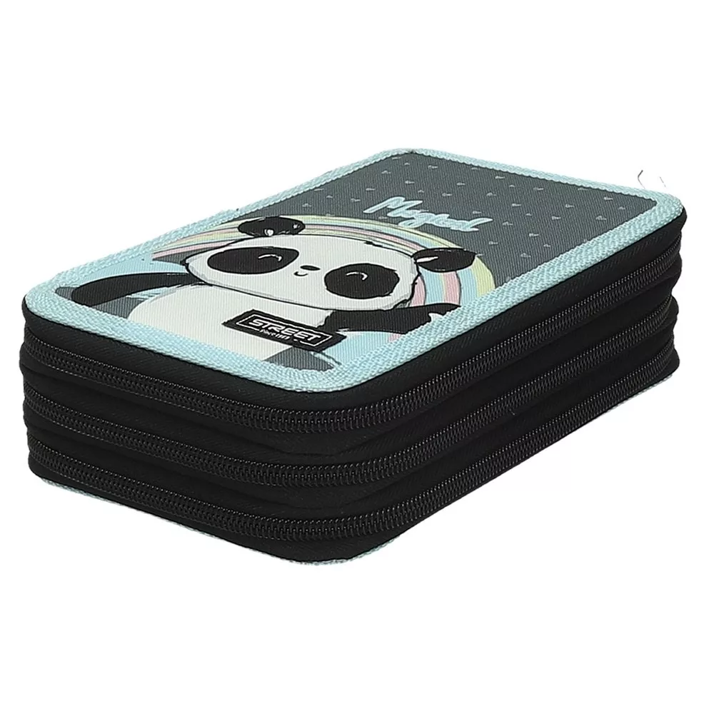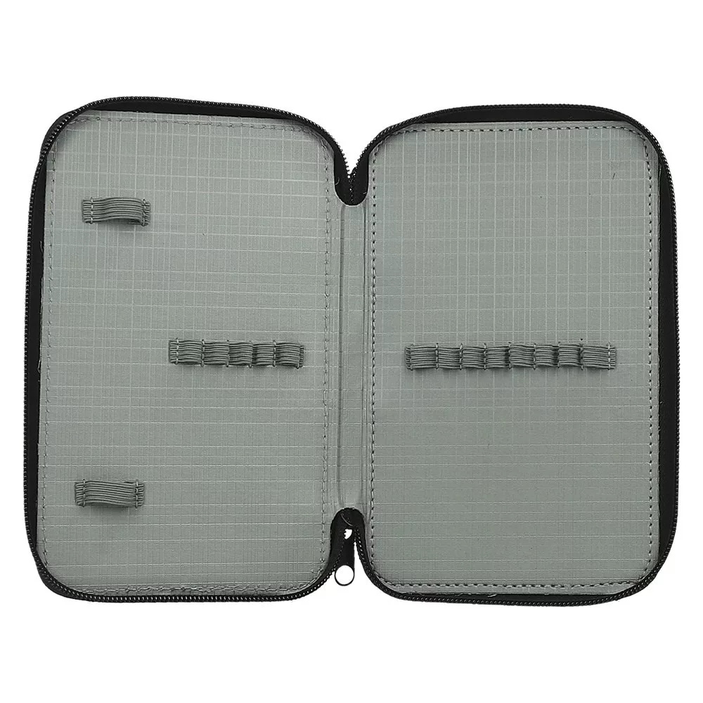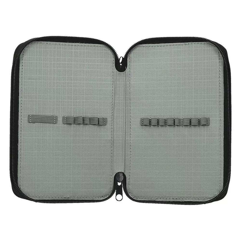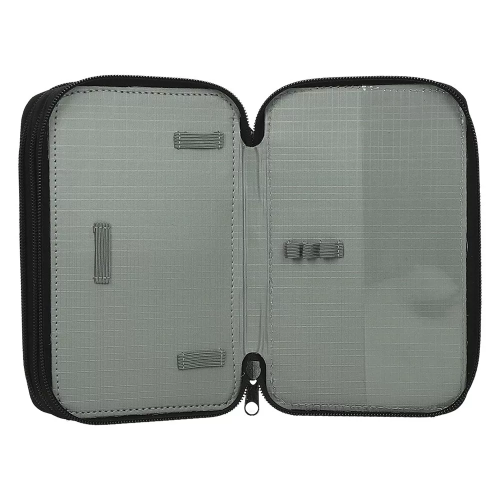 Belül textillel bevont merev lapokkal, gumis kialakítással az írószerek tárolásához, és egy cipzáras belső zsebbel.