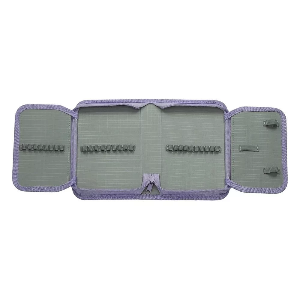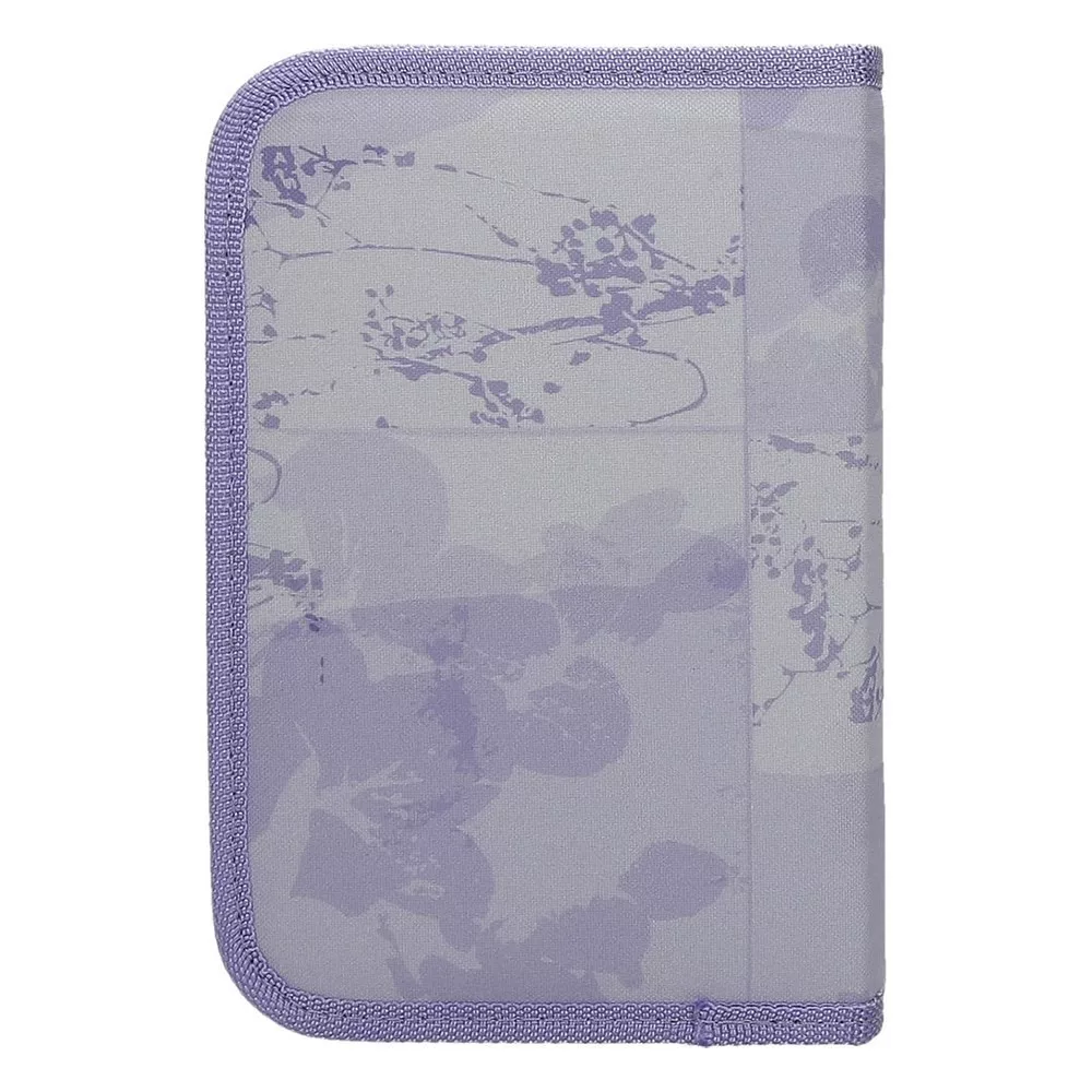 Belül textillel bevont merev lapokkal, gumis kialakítással az írószerek tárolásához, és egy cipzáras belső zsebbel.