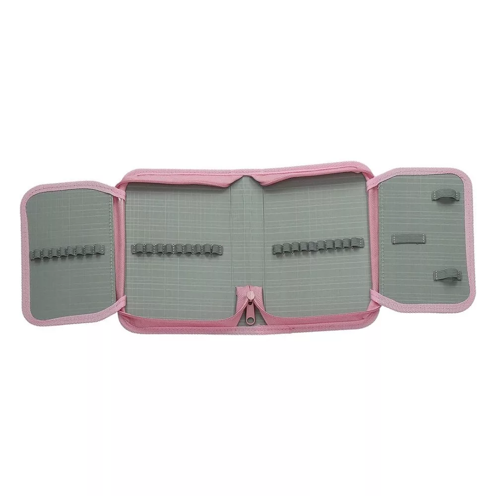 Belül textillel bevont merev lapokkal, gumis kialakítással az írószerek tárolásához, és egy cipzáras belső zsebbel.