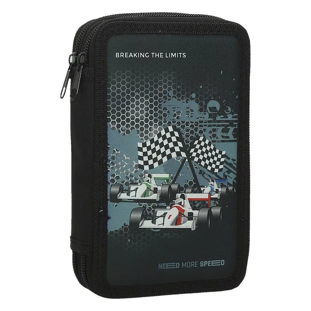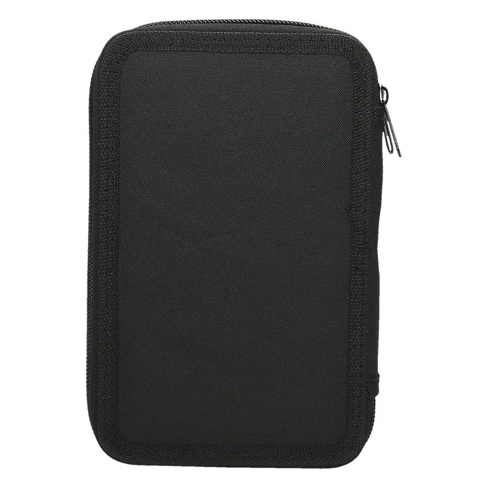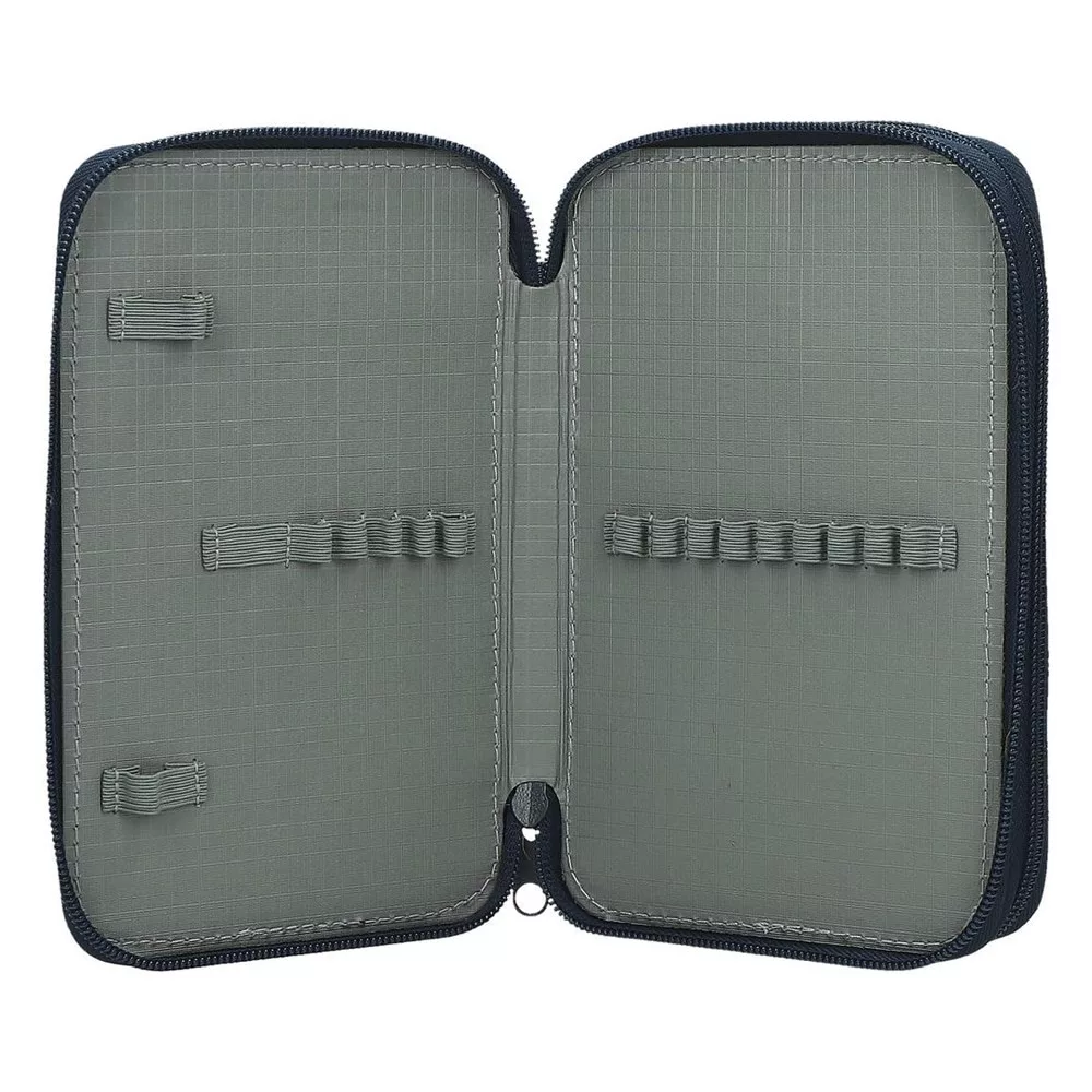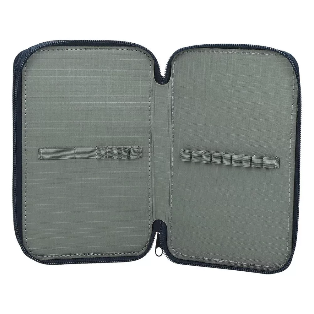 Többszintes, írószerekkel töltött cipzáros tolltartó gumis kialakítással az írószerek tárolásához.