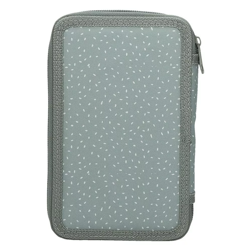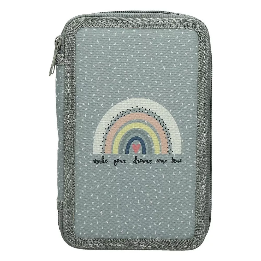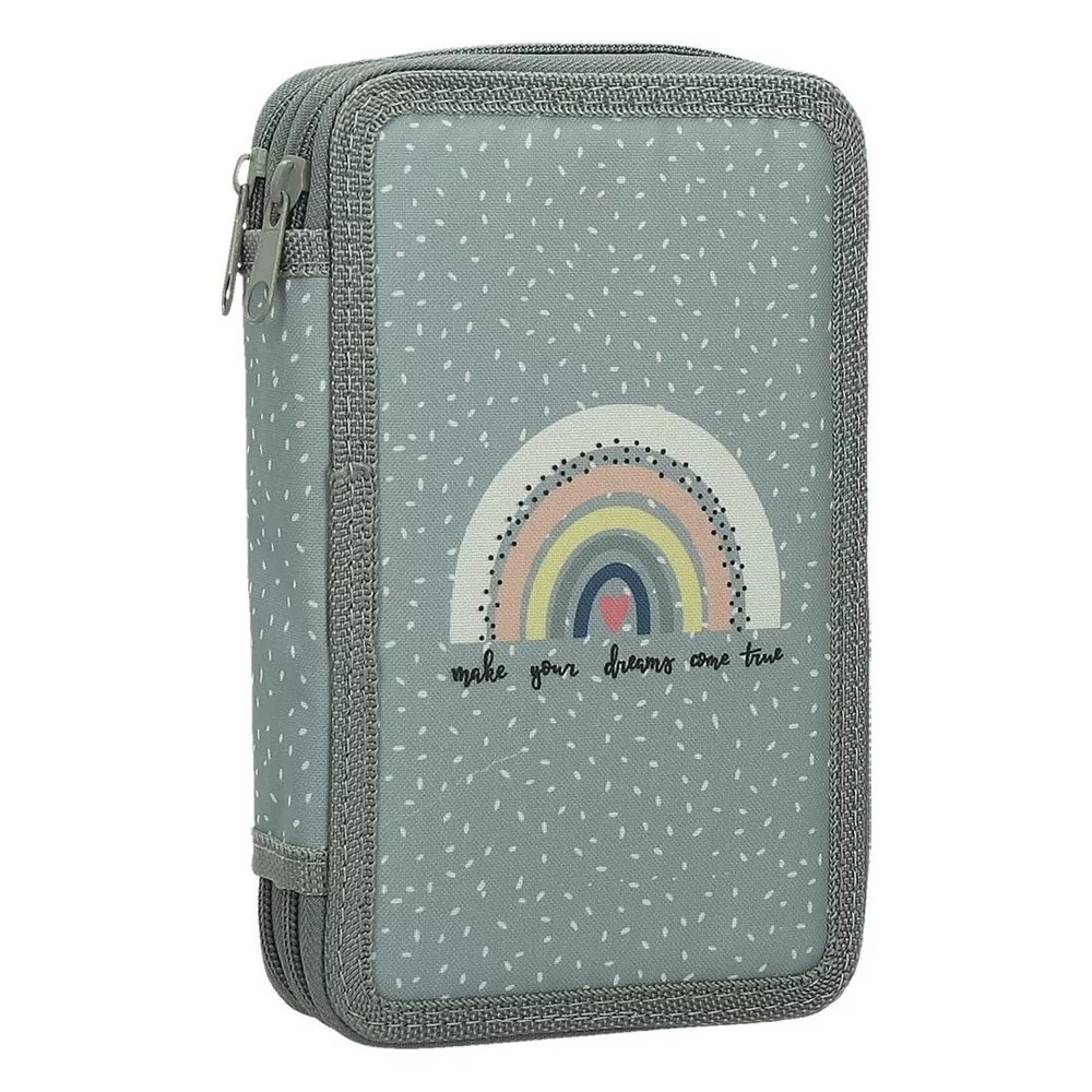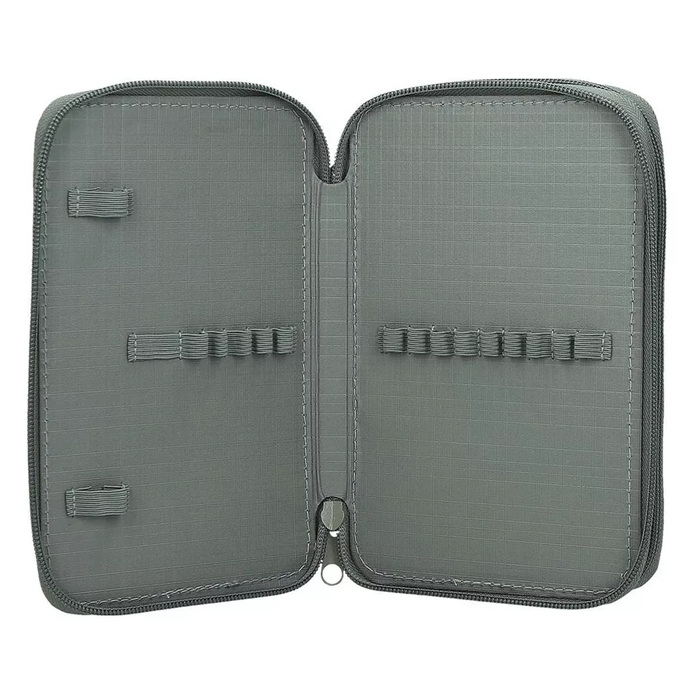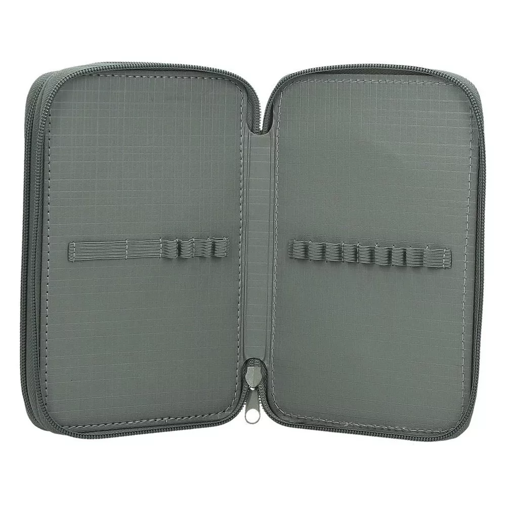 Többszintes, írószerekkel töltött cipzáros tolltartó gumis kialakítással az írószerek tárolásához.