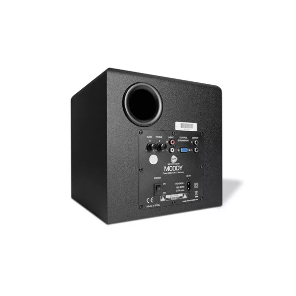 Subwoofer: wooden cabinet with bass reflex technology, bass control, treble control and main power switch