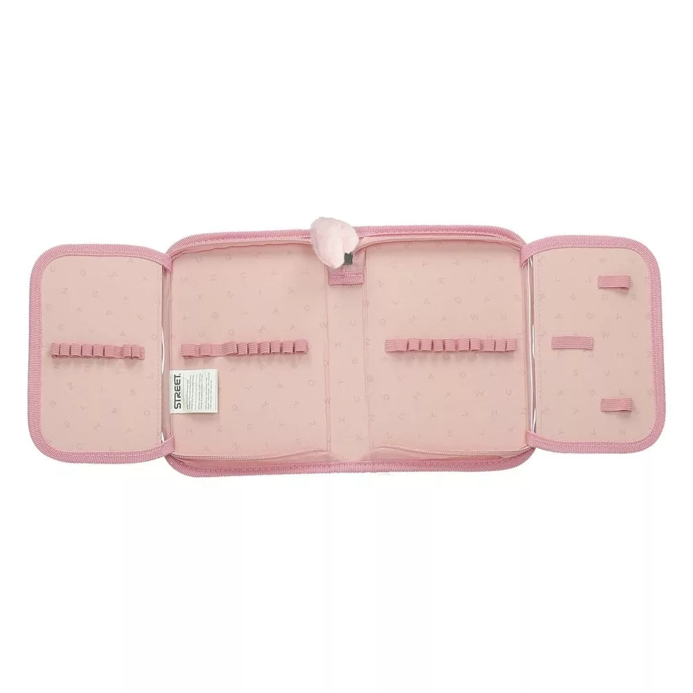 Belül textillel bevont merev lapokkal, gumis kialakítással az írószerek tárolásához.